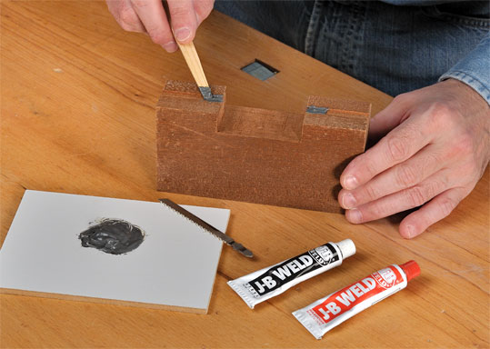 Schritt 1: Das Stichsägeblatt wird mithilfe eines Epoxidharzklebers in die eingefräste Nut eingeklebt. Dieser Zweikomponenten-Kleber von JB-Weld ist ideal für hochfeste Verklebungen von Metall auf Holz. Ein wirklich toller und kraftvoller Kleber, den ihr unbedingt einmal ausprobieren solltet!