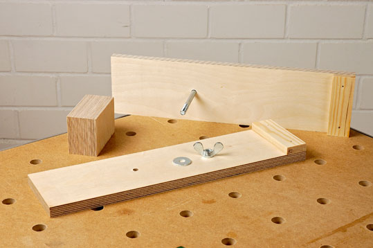 Zwei Spannarme aus Multiplex, eine Schlossschraube mit Flügelmutter und ein Holzklotz als „Gegenlager“ ist alles, was ihr zum Nachbau dieser Holzzwinge benötigt.