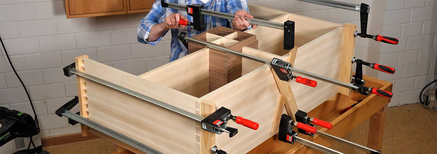 Neben gutem Handwerkzeug gehört auch eine Auswahl an Zwingen zur Grundausstattung. Besonders empfehlenswert sind die Klemmzwingen aus Holz, denn sie hinterlassen wegen Ihrer Korkauflagen keine Druckstellen auf dem Werkstück und der Anpressdruck reicht für die meisten Arbeiten völlig aus. Wollt ihr aber beispielsweise Leimholz selbst herstellen, müsst ihr wegen des wesentlich höheren Anpressdrucks Schraubzwingen verwenden. Zum Schutz der Holzoberfläche benutzt man beim Zusammenpressen immer sogenannte Zulagen aus Restholz.